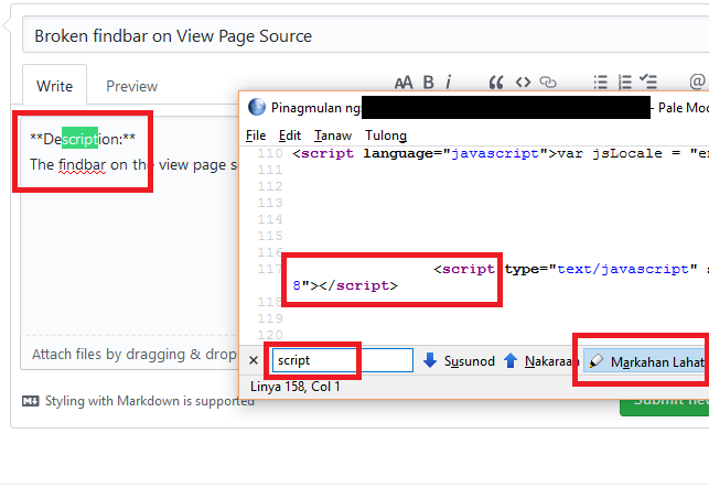 4. Go back to the view source window and press F3 or next/previous or Highlight All